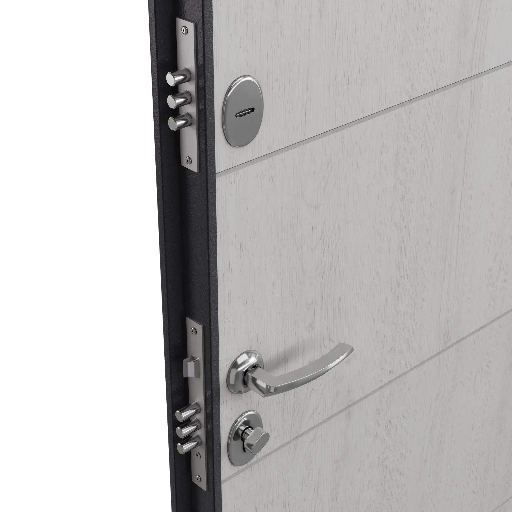 В салоне смотрите на ощущения: ключ поворачивается ровно, щелчки четкие, броненакладка сидит монолитно, закрытая створка не дает люфт при открытии ручки. Для входных металлических дверей в квартиру такая комплектация — рабочий стандарт, который каждый день добавляет уверенности.